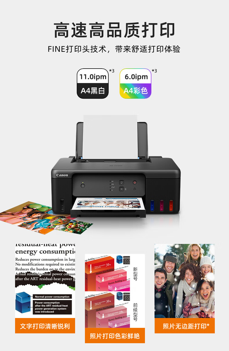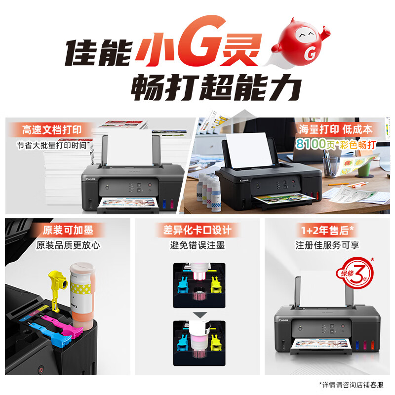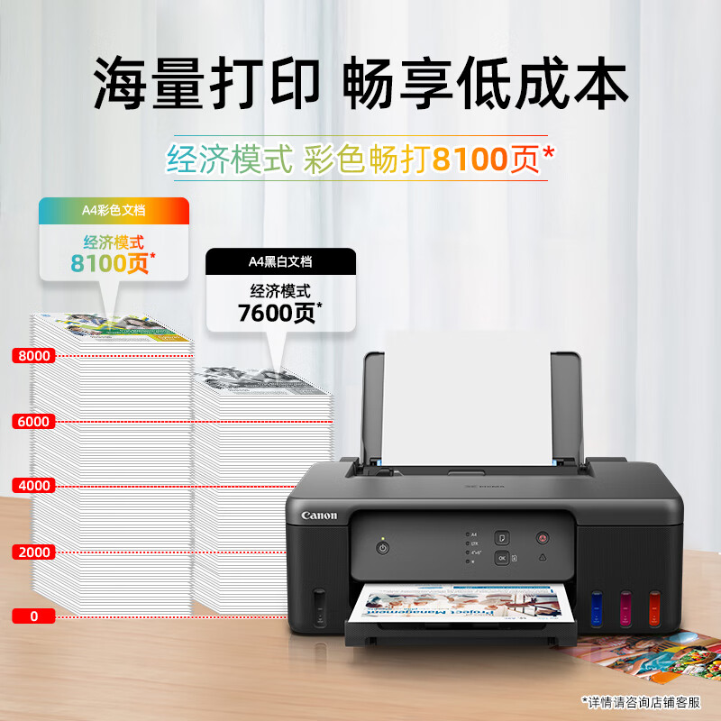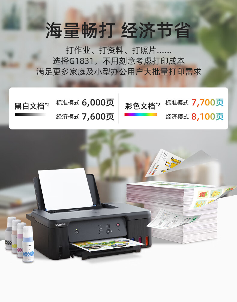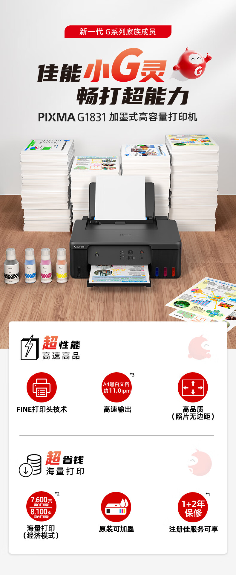 佳能(Canon)G1831大容量可加墨彩色单功能打印机(作业打印/照片打印 学生/家用)
