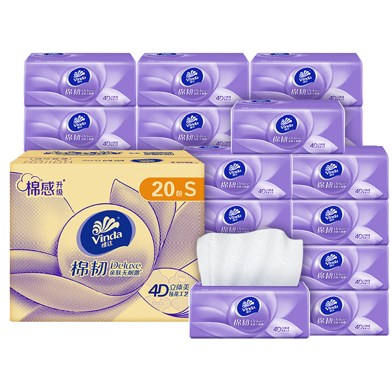 维达(Vinda)抽纸 棉韧3层90抽*20包S码 亲肤无刺激 卫生纸纸巾 餐巾纸 整箱